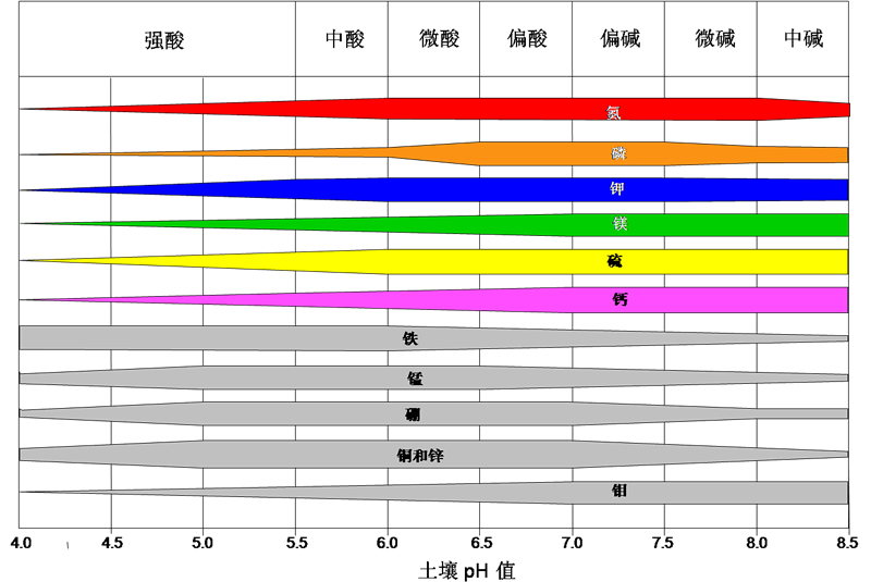 注解:彩色及灰色橫條越寬表示該養分的吸收效率越高,越細表示吸收效率越低,數字表示土壤酸堿度(PH值)。